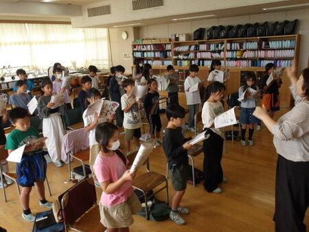 1校時の音楽室です。4年生が音楽の授業をしています。今日は、「旋律の特徴を感じ取ろう」という学習です。曲を聴いて感じが変わったところを探し、旋律について学習しています。旋律を感じながら、手拍子で合わせたり、歌ったりして楽しく学習しています。