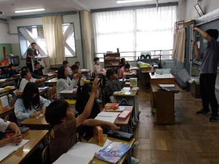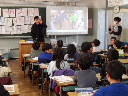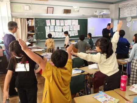 1校時の3年生の教室です。外国語活動の学習をしています。今日のめあては、「アルファベットに親しもう」です。ABCの歌から始まり、体でアルファベットを表現したり、アルファベットの仲間分けをしてどういう仲間で分けたのかお互いに伝え合ったりしています。楽しいアクティビティをしながらアルファベットに親しんでいます。
