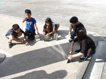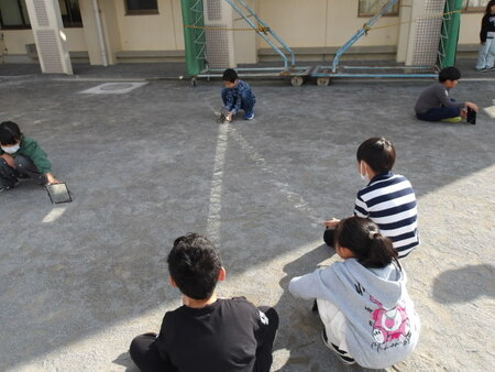 5時間目の校庭です。3年生が理科の実験をしています。光の進み方の学習です。光はどのように進むか、鏡を使って実験をしています。鏡に反射した光をもう一つの鏡に当てて、光の線を作っています。一つの鏡では光が弱い班があるようで、二つの鏡を使って光を集めています。グループで協力して実験をしています。