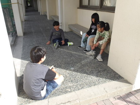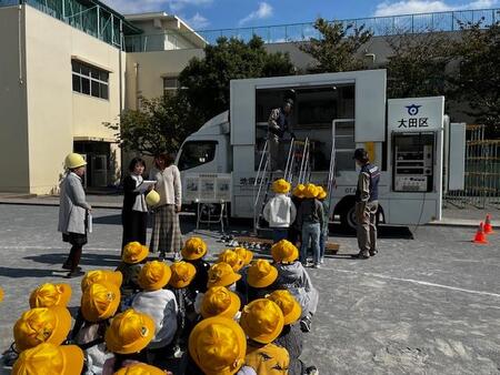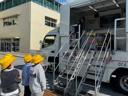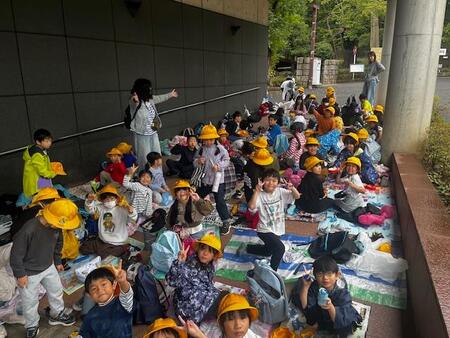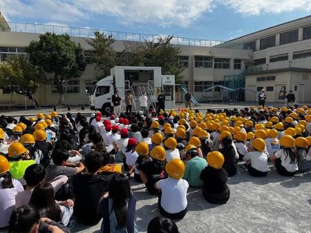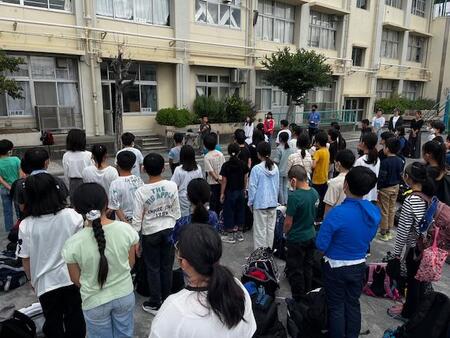 中休みの校庭です。今日は、休み時間の避難訓練がありました。地震による避難訓練です。サイレンが鳴り響いた後、校庭で遊んでいたこどもたちは、一斉に校庭中央に集まりしゃがみました。校舎内のこどもたちも机の下にもぐったり、柱の近くでしゃがんだりとそれぞれが身を守る行動をとっていました。全員の安全が確認できた後、今日は起震車体験をしました。先生方がお手本を見せた後、1年生と6年生が震度5強の揺れを体験しました。