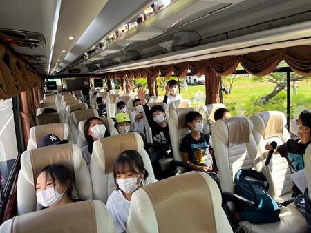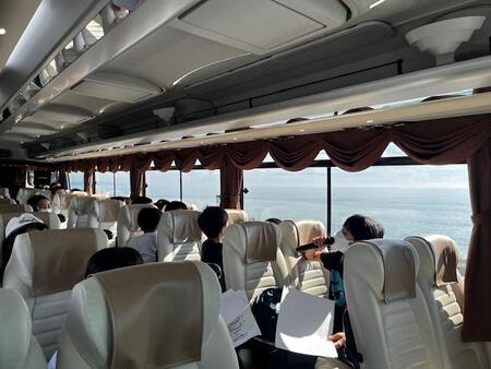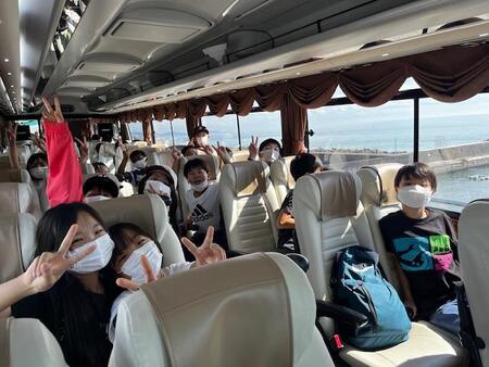 小田原で高速道路を降り、海に出た途端歓声が上がりました。久しぶりに見る海にこどもたちも興奮しているようです。車内では、バスレクで盛り上がっています。