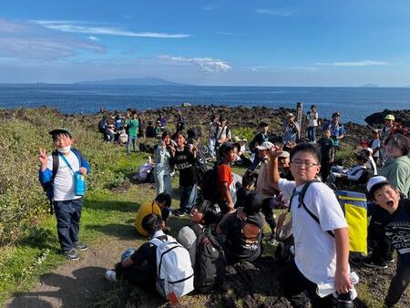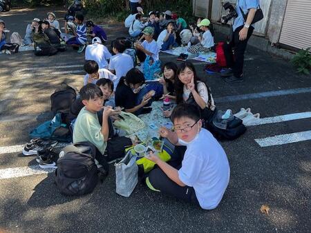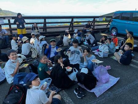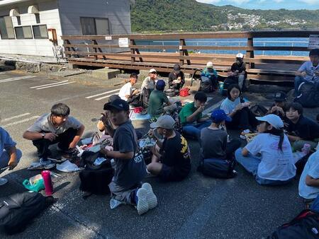 交通状態も良好で、予定より少し早くぼら納屋に到着しました。海岸沿いでお昼ご飯を食べています。おうちの方の作ってくれたお弁当を美味しくいただいています。エネルギーを満タンにしてこれからハイキング出発です。