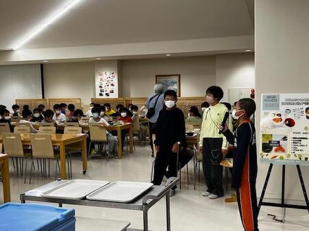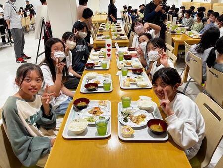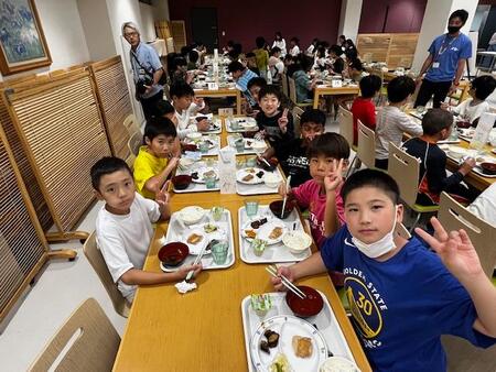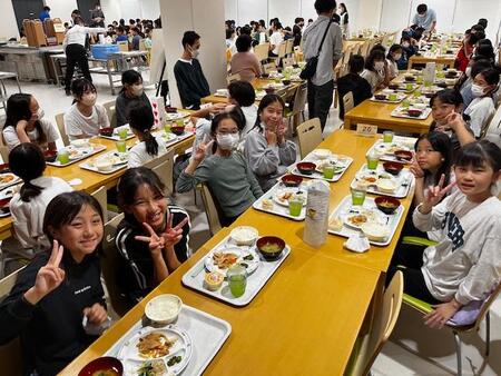 夕食の時間です。いただきますの前に一緒に宿泊する大森第四小学校のこどもたちと顔合わせ式を行いました。両校そろっていただきますをして、食事が始まりました。大きな声を出さずに静かに食べています。お代わりをする子も多く、残り物はありませんでした。ほとんどの子が完食していました。たくさん歩いたのでおなかもすいたことでしょう。