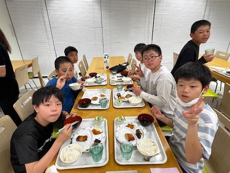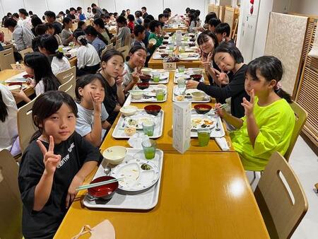 2日目の夕食の時間です。こどもたちも元気で美味しく夕食をいただいています。昨日と同じでみんなよく食べています。みんなと一緒の時間は、楽しそうですが、こどもたちと話していると、ちょっとホームシックになっている子もいるのかな?