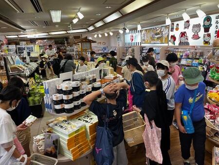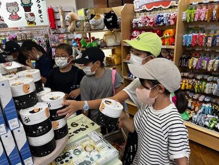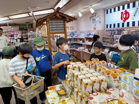 キーホルダー作りと並行して半分のグループがお土産を買いに駅の伊豆高原駅のお土産屋さんに来ています。家族のことを思い浮かべながら、買い物をしている姿は微笑ましいです。買い物をして、お店から出てくると「結構いいもの買えたぁ!」と満足そうにしている子、「お父さんとお母さんにこれ買ったんだ。」とお土産を見せてくれる子等々それぞれの子がお土産選びに満足したようです。これからお昼ご飯を食べて帰ります。