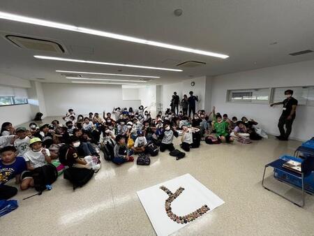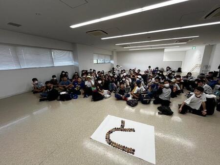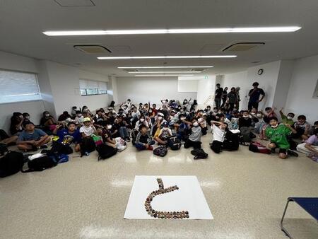 伊豆高原学園リニューアル10周年記念事業で、大田区の小学5年生にキーホルダーを作ってもらっています。各校で1文字ずつキーホルダーで文字を作り、それを一つの文章にして、掲示するという取組事業です。本校は、「と」という文字を担当しました。みんなで作ったキーホルダーを並べて、文字が完成しました。