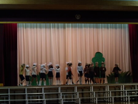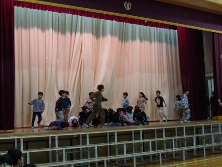3校時の体育館です。2年生が学芸会の練習をしています。こどもたちもセリフを覚えていますが、動きはまだまだのようです。これからどんどん上手になってすてきな劇になっていくことでしょう。2年生がんばって!