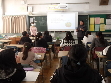 3校時の6年生の教室です。家庭科の学習をしています。今日は、栄養士の先生に来ていただいて各学年の残菜状況について話を聞いているようです。「〇年生は、キノコの残菜が多いです。」という話を聞いて、「きくらげは出ないのですか?」という質問。「きくらげ好きな人?」と先生が聞くと、多くの子が挙手していました。それぞれの学年の話を聞いて6年生はこれから全校のみんなにおいしく食べてもらうための献立を考えていきます。今年はどんな献立ができるのでしょう。今から楽しみです。