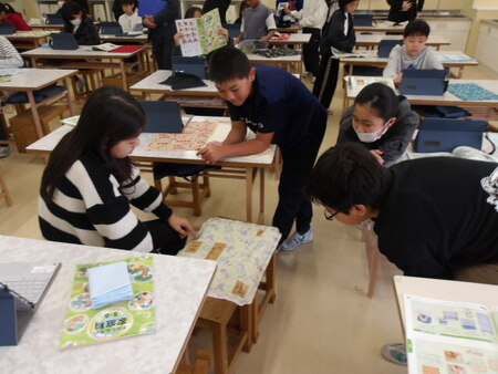 3校時の家庭科室です。5年生が、授業をしています。「ランチョンマット」の制作の学習です。どのように作っていくのか制作計画を考えています。先生が用意したいくつかの工程のお手本を見ながら、どの順番に制作していくのか考えています。一人で考えたり、近くの子と話し合ったりしながら、その制作過程について学んでいます。前回までミシンの練習をしてきたので、ミシンを使って上手に世界に一つだけのランチョンマットができるといいです。