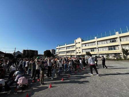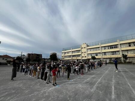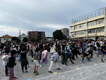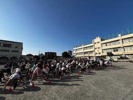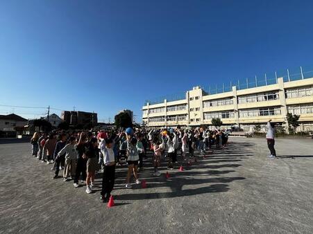 朝の校庭です。体育朝会をしています。今日は、1,3,5年生がクラスの列ごとにボール回しリレーをしています。頭の上から後ろへ、股の下を前へ、体の右側から後ろへ、左側から前へと2往復してゴールです。2回目は、1年生、3年生、5年生それぞれにハンデが与えられて競争です。どの学年もチームワークよく楽しく活動しています。朝から体を動かして気持ちのよい1日のスタートです。