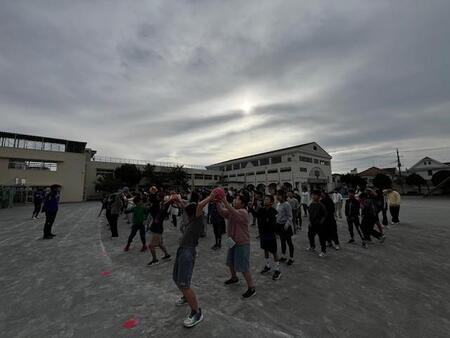 朝の校庭です。2,4,6年生が体育朝会をしています。ボール回しリレーです。各クラスチームになってボール回しをしています。どのチームもチームワークよくボールを回しています。2回目は、4年生と6年生にハンデがつき、10秒後に4年生、15秒後に6年生がスタート。それでも4,6年生は早いボール回しをしています。2年生も頑張り、3回目は1位でゴールしました。楽しい朝の運動です。
