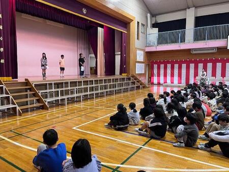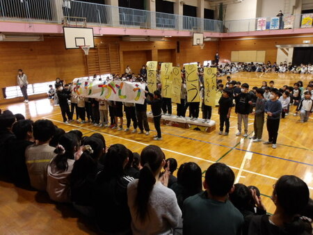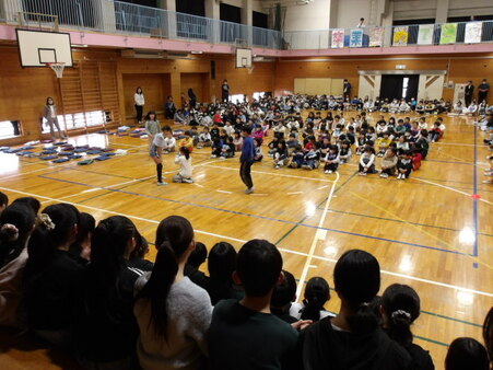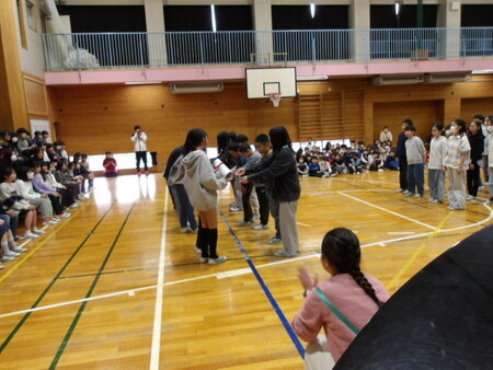 今日は、6年生を送る会が開かれています。今まで道塚小を引っ張ってきてくれた6年生に感謝の気持ちを込めて、各学年が出し物をしています。6年生もお礼の出し物をしています。どの学年もよく考えて、練習してきた出し物で温かな会となりました。