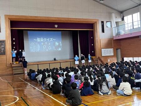 今日は、6年生が全校児童に向けて、「おおたの未来づくり」で学習してきた「藍染」について発表をしています。先日カムカム新蒲田で発表したグループとは、別のグループが発表しています。クイズを入れながら楽しませながら発表しています。「藍染の学習」が本校の伝統になりつつあります。