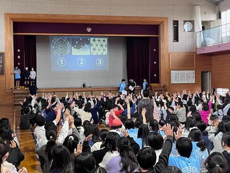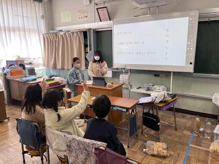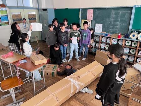 4年生の教室です。4年生が総合的な学習で学んできた「防災」について、3年生や2年生に向けて発表をしています。大地震の様子や新聞で作る防災スリッパの作成などの体験型発表があったり、タブレットを使った発表あったりするなど学んできたことをわかりやすく発表していて感心します。