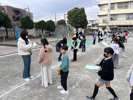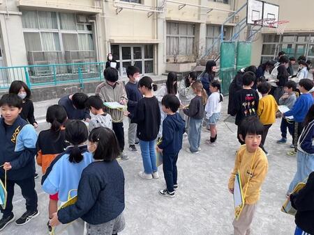 今朝の校庭です。今年度最後の集会が行われています。今日は、お世話になった6年生にサインをもらおうという集会です。校庭の周りに並んだ6年生から一人ひとりサインをもらって集めています。残り数日となった6年生との別れを惜しみながら、サインをもらっている下級生です。