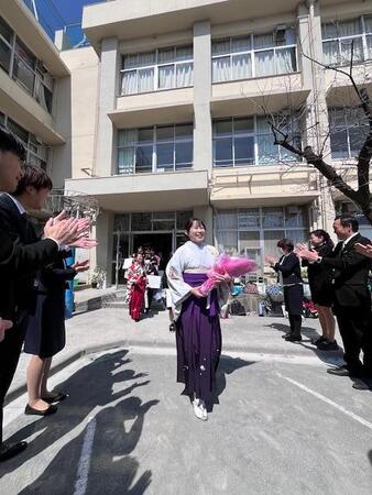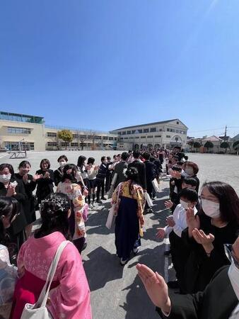 よく晴れた本日。6年生のこどもたちが道塚小学校を旅立っていきました。この1年間、道塚小を引っ張ってくれたリーダーが卒業していきました。式後、校庭で教職員、下級生、保護者の間を歩いていくこどもたちは、清々しい顔をしていました。校庭では、スマイルパパが設置してくれたフォトスポットで写真を撮る姿が見られ、小学校での日々を名残惜しく感じているこどもたちでした。6年生の皆さん、ご卒業おめでしょうございます。中学校へ行っても元気で頑張ってください。