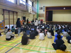 今日の児童集会は「じゃんけん列車」でした。上級生と下級生が仲良く列車になっているのは、見ていても微笑ましいものです。最後に、先頭の人に全員で拍手を贈りました。