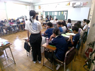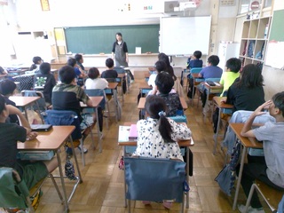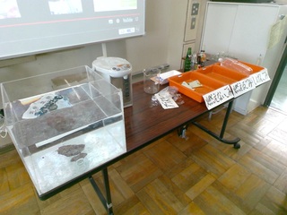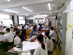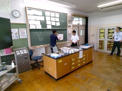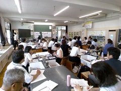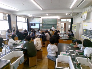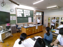 学校の夏休み期間中は、先生方の研修会が集中します。今日は、区内の小学校の先生たちの理科授業研修会です。午前と午後に分けて、理科室で模擬授業を行いました。先生役と児童役に分かれて、真剣に授業検討を行っていました。