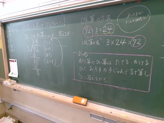 今日は4時間目に4年生の算数の授業を参観しました。割り算の筆算の習得は、これ以後の算数学習の基礎の一つになるとても重要なことです。筆算の方法と仕組み、検算などについて細かく説明し、何度も練習させていました。