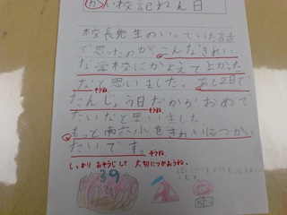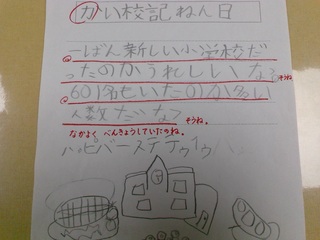 6月5日は南六郷小学校の39回目の開校記念日でした。月曜日の全校朝会で私がそのことを話すと、2年生がこんなすてきなカードを書いてくれました。給食は、赤飯と牛乳、さばのごまみそ焼き、じゃがいものそぼろ煮、南六ゼリーのお祝いメニューです。学校や地域を愛し、大切にしていく心を、しっかり育てていきます。