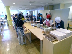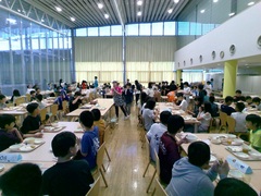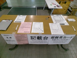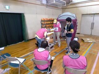 土曜日の開催でしたが、大変に多くの方々に御協力いただきました。改めて、地域の方々の防災意識の高さを感じることができました。全体が6つの班に分かれ、それぞれ水害時と地震時を想定して訓練に当たりました。水害時の想定では、実際の受付の設置や校内の避難所配置と防災備蓄倉庫の点検、地震時の想定では、起震車による揺れ体験と発電機・トイレの設置訓練を、それぞれ行いました。意見交流では、実際の設置時においての役割分担や分かりやすい物品の収納方法など、本番に備えての多くの質問が出されていました。参加者の方々の意識の高い、とても充実した内容の訓練でした。