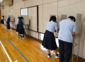 また、今年度の選挙は、生徒に実体験をさせたい、選挙という雰囲気を味わってほしいという想いから、本物の投票台や投票箱を借りて実施しました。数年後、大人になってする選挙を前に、よい経験になったのではないかと思います。