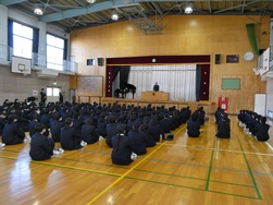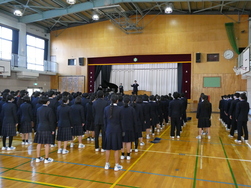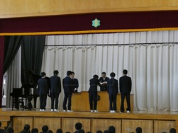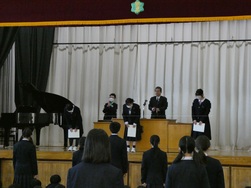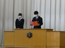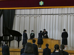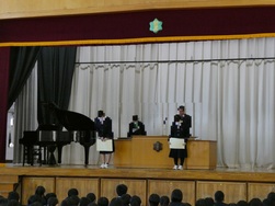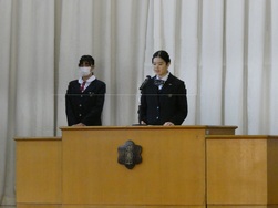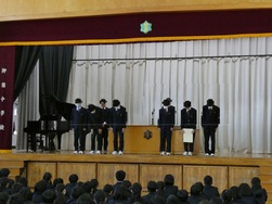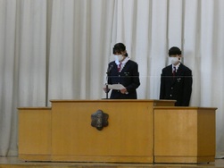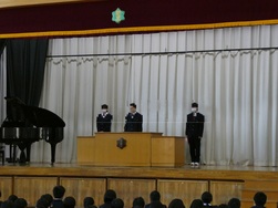 式では校歌斉唱や校長先生のお話のほか、生活指導担当からの冬休みの過ごし方についての話、各学年の代表生徒から「2学期を振り返って」の話がありました。