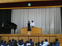 終業式では校長先生の話や、各学年の代表生徒から「1学期を振り返って」の話がありました。真剣に話を聞くことができていました。