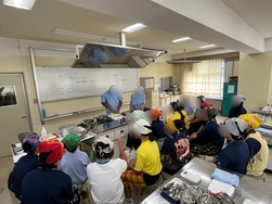 「給食メニュー作り ~栄養と健康について学ぼう~」の様子(調理師さんのお手本を見てからのスタートでした!)
