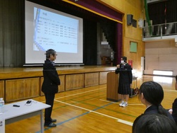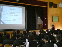 この授業では日本人の死因の推移や、がんの予防と早期発見の大切さなどを学びました。生徒たちは緊張していたのか、始めのうちは講師の先生の質問にもなかなか答えられませんでしたが、次第にしっかりとした発言ができるようになりました。