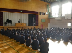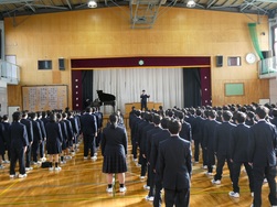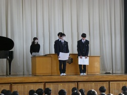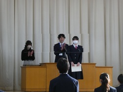 校長講話、生活指導の話、校歌斉唱のほか、各学年の代表生徒から「2学期の反省」がありました。