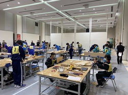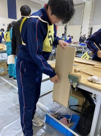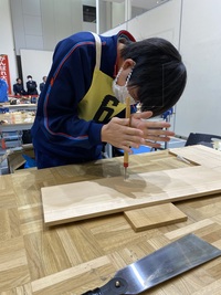ものづくり教育・学習フォーラムの競技会には、2年生の生徒2人が代表として参加し、1枚の板から木工作品をつくりあげました。