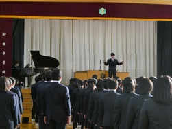 今学期から校歌斉唱の指揮者、伴奏者は2年生の代表生徒が務めます。代表の生徒たちは、緊張した面持ちでしたが、堂々と行ってくれました。