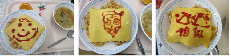 この日のオムライスは、栄養教諭の計らいでケチャップで自由に絵を描ける特別バージョン。
