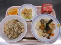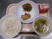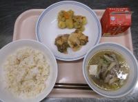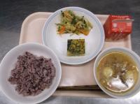 明日は卒業式です。門出を祝い、お赤飯や生徒が好きなから揚げの献立にしました。最後の給食、満足してもらえますように。