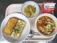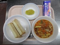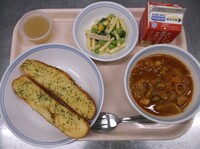 ガーリックトーストは、パンん切り込みににんにくバターを塗り、オーブンで焼きました。ソフトな仕上がりで、生徒もよく食べてくれました。ただ、食べた後、歯を磨きたくなると言われました。
