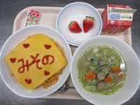今年度最後の給食でした。オムライスは、生徒にケチャップで仕上げをしてもらえるよう、個包装のケチャップにしました。それぞれ文字や絵を書いて食べていました。