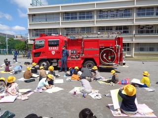 1、2年生は、消防写生会がありました。学校の中庭になってきた消防車を囲んで、絵を描きました。真っ赤な消防車を画用紙いっぱいに描くことができました。