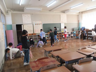 上学年が下学年に掃除の仕方をアドバイスしたり、自主的にきれいにできそうな場所を探したりしていました。