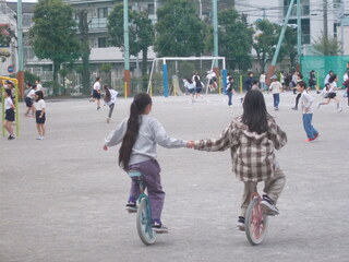 こどもたちは新しい友達と誘い合って、校庭で元気に遊んでいます。中萩中小学校の校庭は広くていいですね。校庭遊具を使って遊ぶこどもたち、担任の先生を交えておにごっこをするこどもたち、一輪車、ボール、思い思いに遊ぶ姿が見られ、微笑ましい光景です。