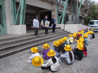 入学式で1年生には安全について話しました。今日、こどもたちは安全に学校に来るために大切なことを学びました。教育委員会より交通安全指導員の方が2名、そして蒲田警察署より交通課の方が1名、お忙しい中、こどもたちのために来てくださいました。