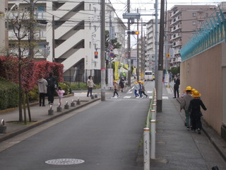 入学して4日目の1年生。話を聞く姿勢が立派です。車の運転手から分かりやすい手のあげ方を練習して、いよいよ実践です。学校とコーナンの前の交差点を信号に従って渡る練習をしました。どの子も左右の確認の仕方、手のあげ方がばっちりできています。ぜひ今日学んだことを登下校だけでなく、日常生活の場面で生かしてほしいです。上手に横断歩道を渡れましたよ。