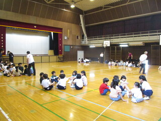 1,2年生が体育館で顔合わせをしていました。来週はグループで学校探検、2年生は1年生に校内を案内する大事なお仕事があります。グループごとに名前、好きなことなど自己紹介をしていました。来週月曜日には、中萩中小学校のことを先輩として詳しく教えてくださいね。