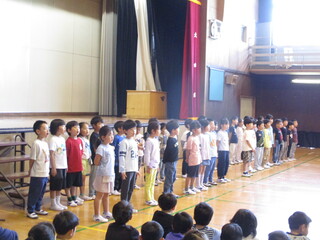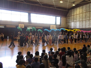 今日は1年生を迎える会です。全校のこどもたちが初めて一堂に会します。