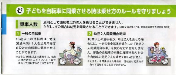 子どもの自転車の同乗については、「道路交通法第57条」「東京都道路交通規則第10条」により、【16歳以上の運転者は、幼児(6歳未満)1人を幼児用座席を設けた自転車に乗車させることができる】となっており、小学生を自転車に同乗させることはできないこととなっております。