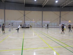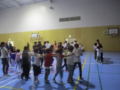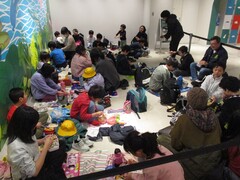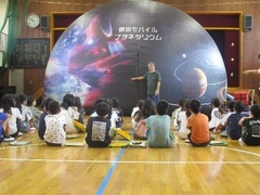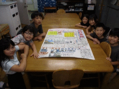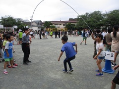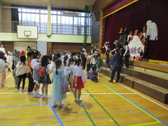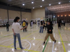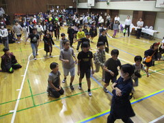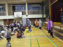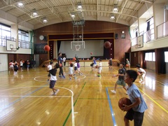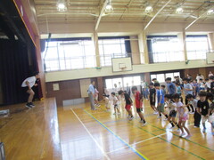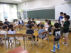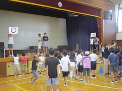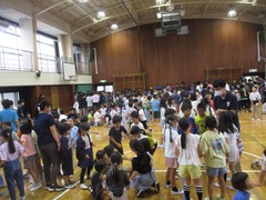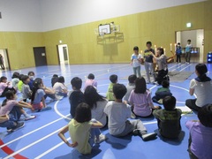 夜は、出雲小学校、東糀谷小学校との交流会を体育室で行いました。44人のこどもたちが交流しました。