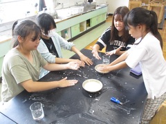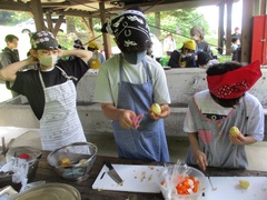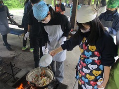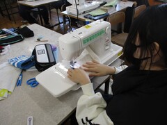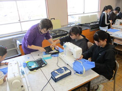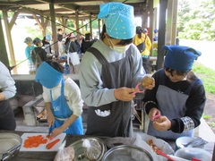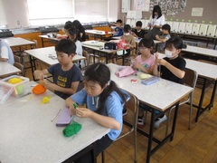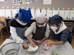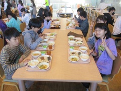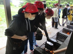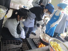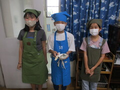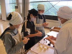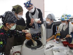 四組の調理実習は「おにぎり」でした。お茶碗にラップにかけて、ご飯と具材を入れて、「おいしくなーれ」と言いながら、握っていました。おすそわけをいただきました。おいしかったです。