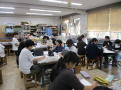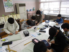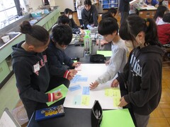 4年2組の図工、題材は「ビー玉パチンコ」です。どんなパチンコゲームにするか班で話し合っています。