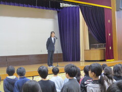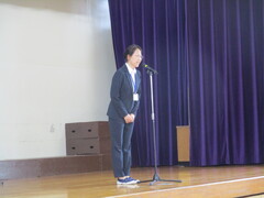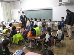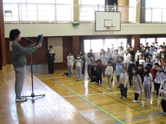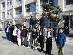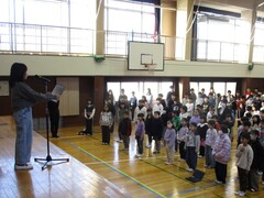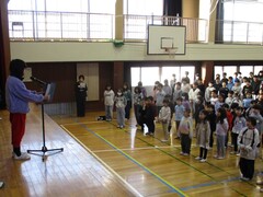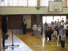 3月で異動された先生方をお招きして、こどもたちからメッセージと花束を贈りました。先生方からのお話をお聞きしたり、お別れの歌をこどもたちから先生方に歌ったりした後、全員で校歌を歌い、先生方をお送りしました。新天地でもご活躍ください。