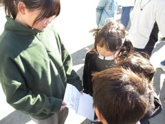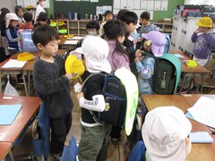 1年生が年長のこどもたちにランドセルの荷物のしまい方、名札の付け方など、学校での生活の仕方を優しく教えていました。